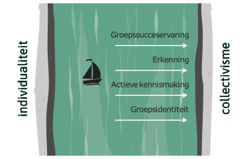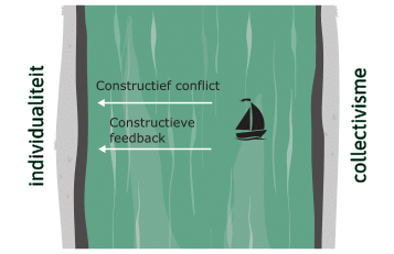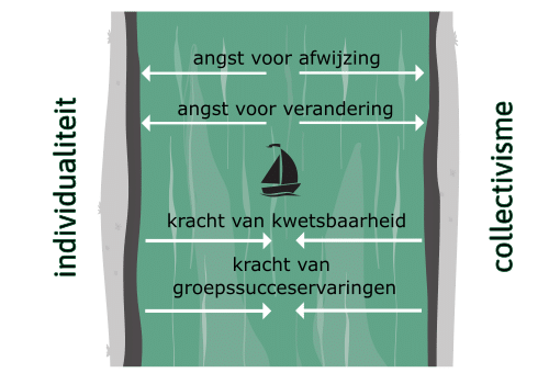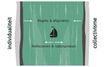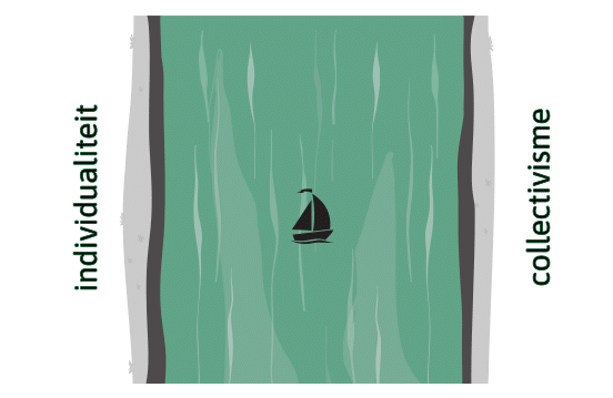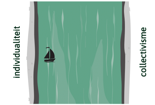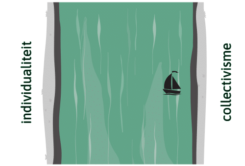 Die balans visualiseren we als een rivier tussen twee oevers: het individualisme en het collectivisme. De ideale balans tussen individuele ruimte en verbondenheid met de groep vinden we in het midden van de rivier.